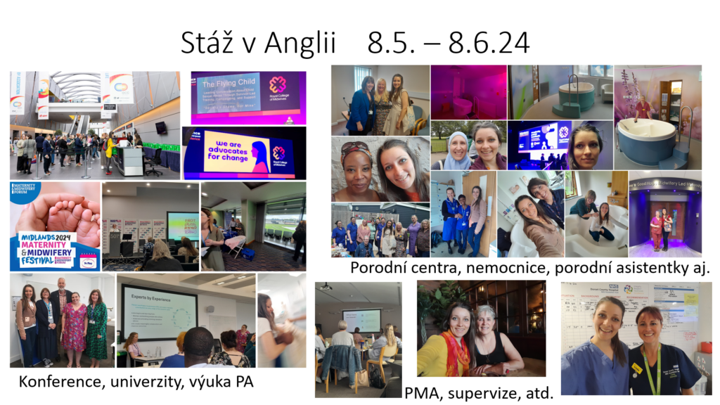 • 8. 5 – 8. 6. 2024 stáž v Anglii, konference Royal College of Midwives, Maternity & Midwifery Festival, konference Bournemouth University atd., více na samostatné stránce zde