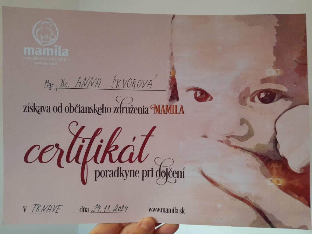 • během podzimu 2024 jsem absolvovala základní certifikační kurz Laktačního poradenství organizace Mamila, Trnava Slovensko